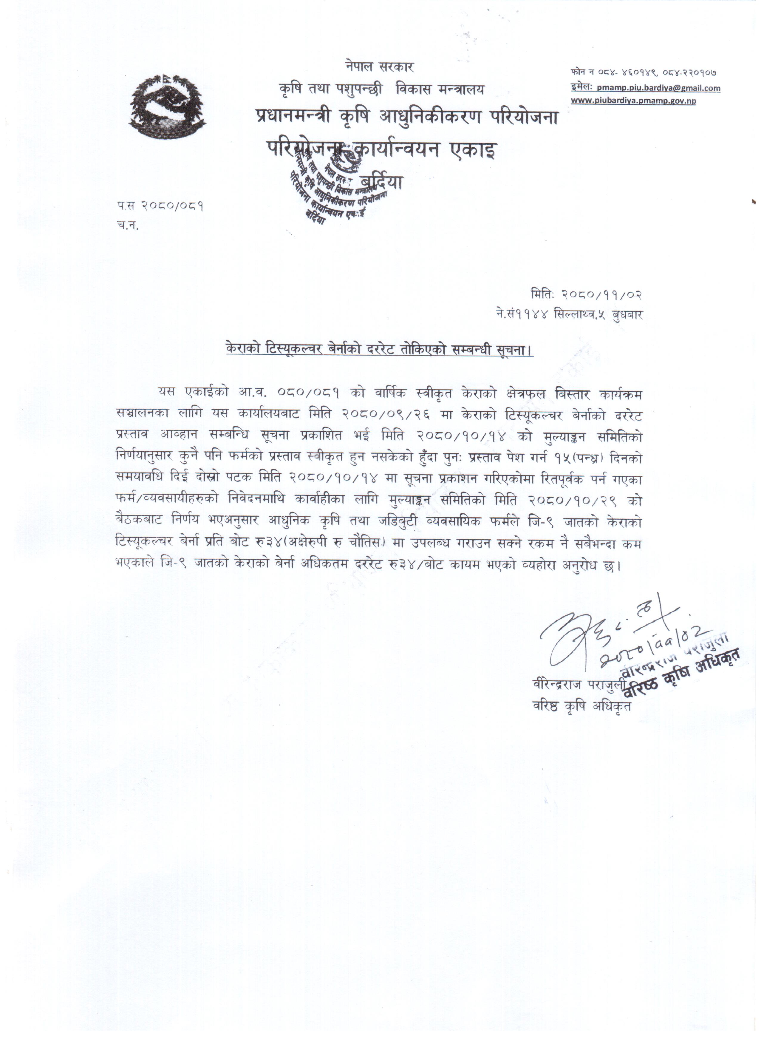 केराको टिस्यूकल्चर बेर्नाको दररेट तोकिएको सम्बन्धी सूचना ।