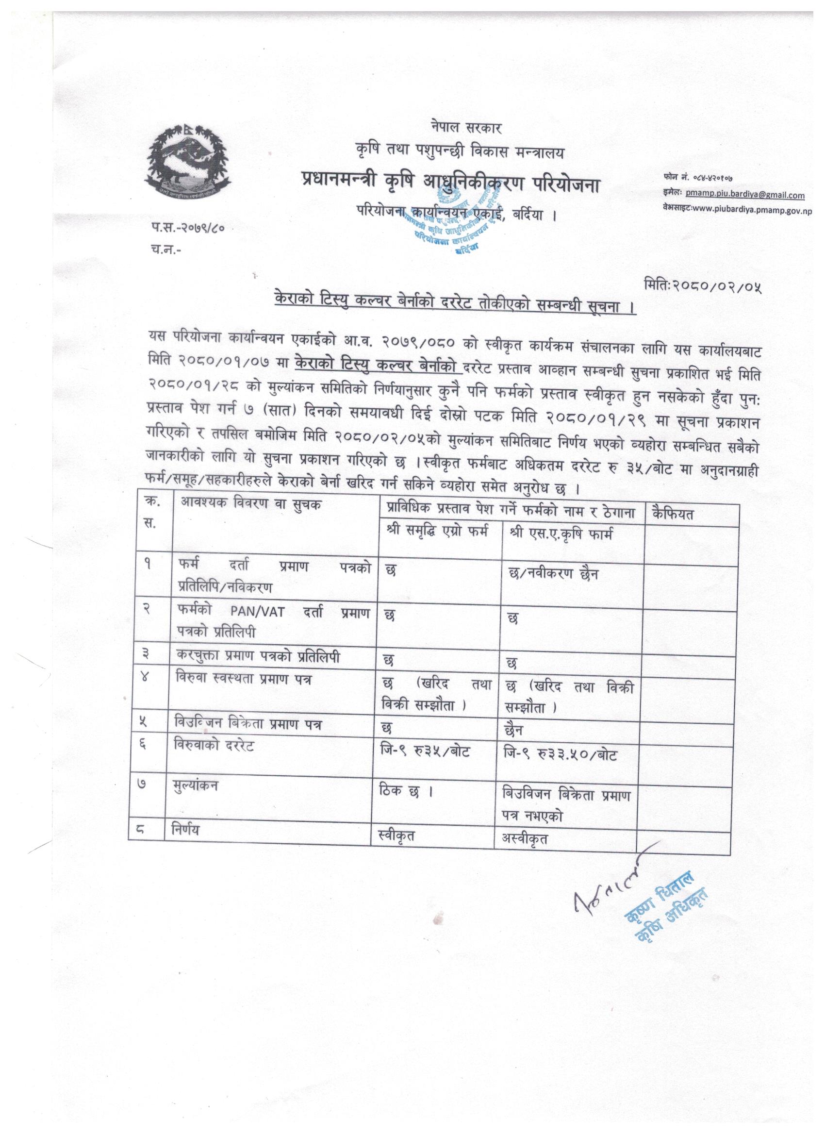 केराको टिस्यु कल्चर बेर्नाको दररेट तोकीएको सम्बन्धी सूचना