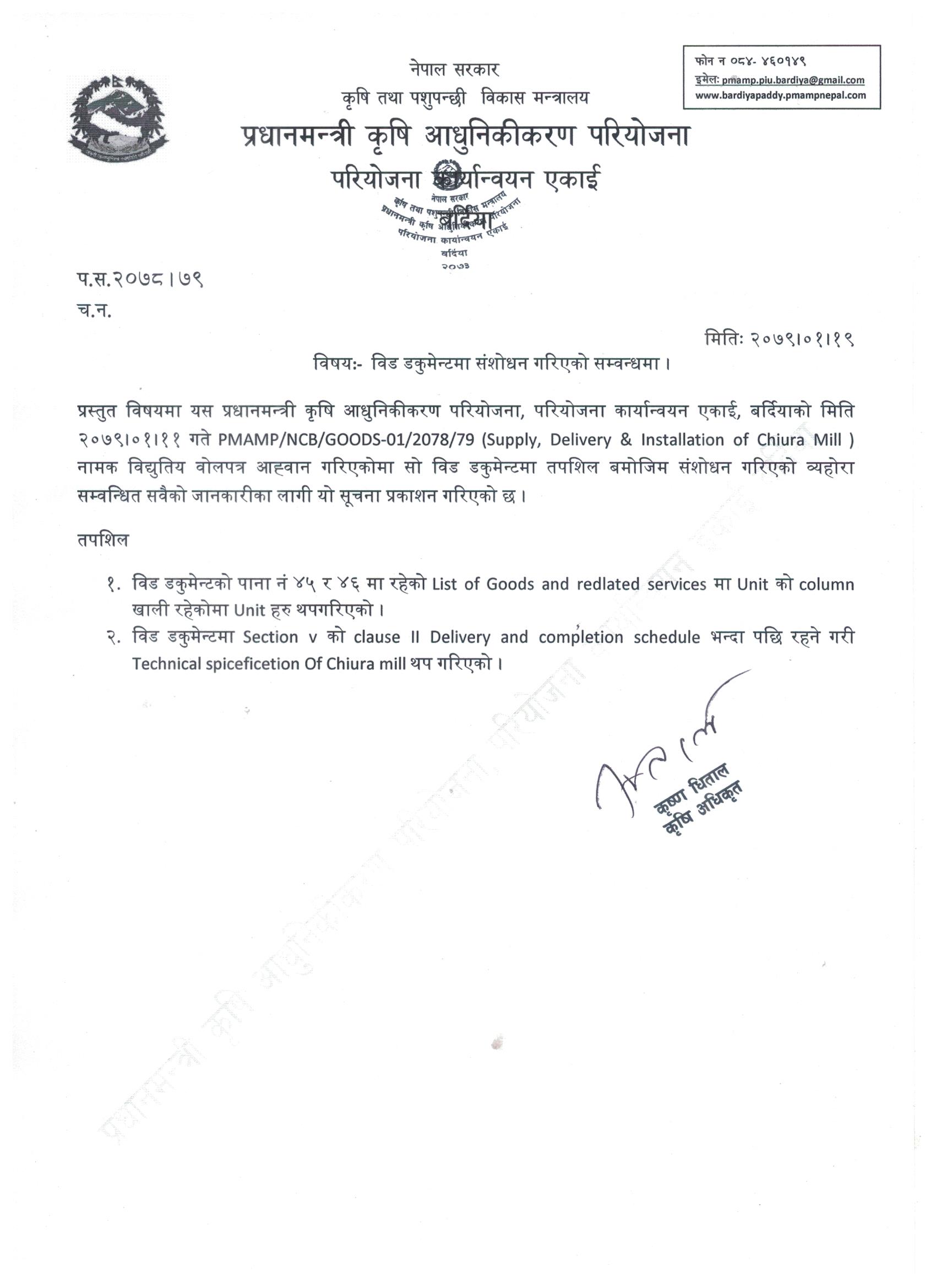 मिति २०७९।०१।११ मा आह्वान गरिएको विद्युतीय बोलपत्रमा कागजात थप गरेको सम्बन्धी सुचना ।