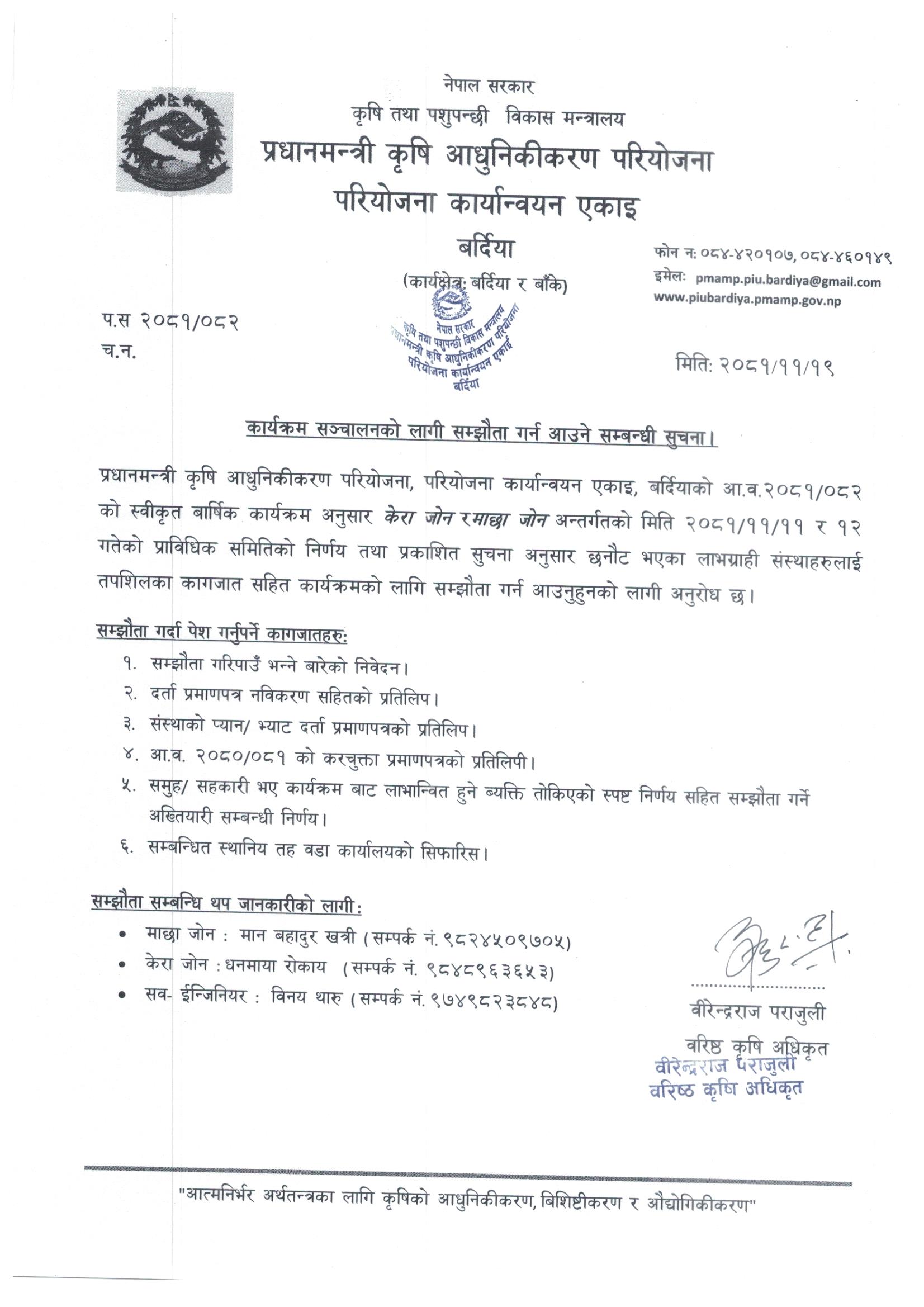 केरा जोन र माछा जोनका लाभग्राही सम्झौता गर्न आउने सम्बन्धि सुचना ।