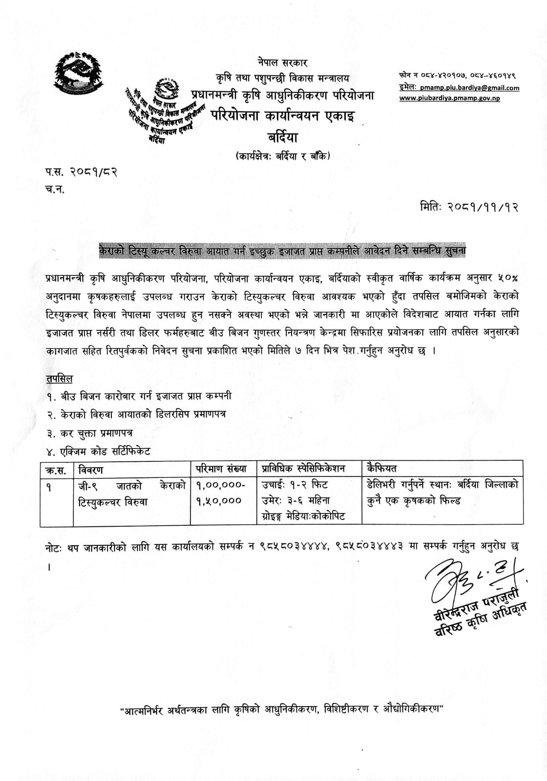 केराको टिस्यु कल्चर विरुवा आयात गर्न इच्छुक इजाजत प्राप्त कम्पनीले आवेदन दिने सम्बन्धि सुचना ।