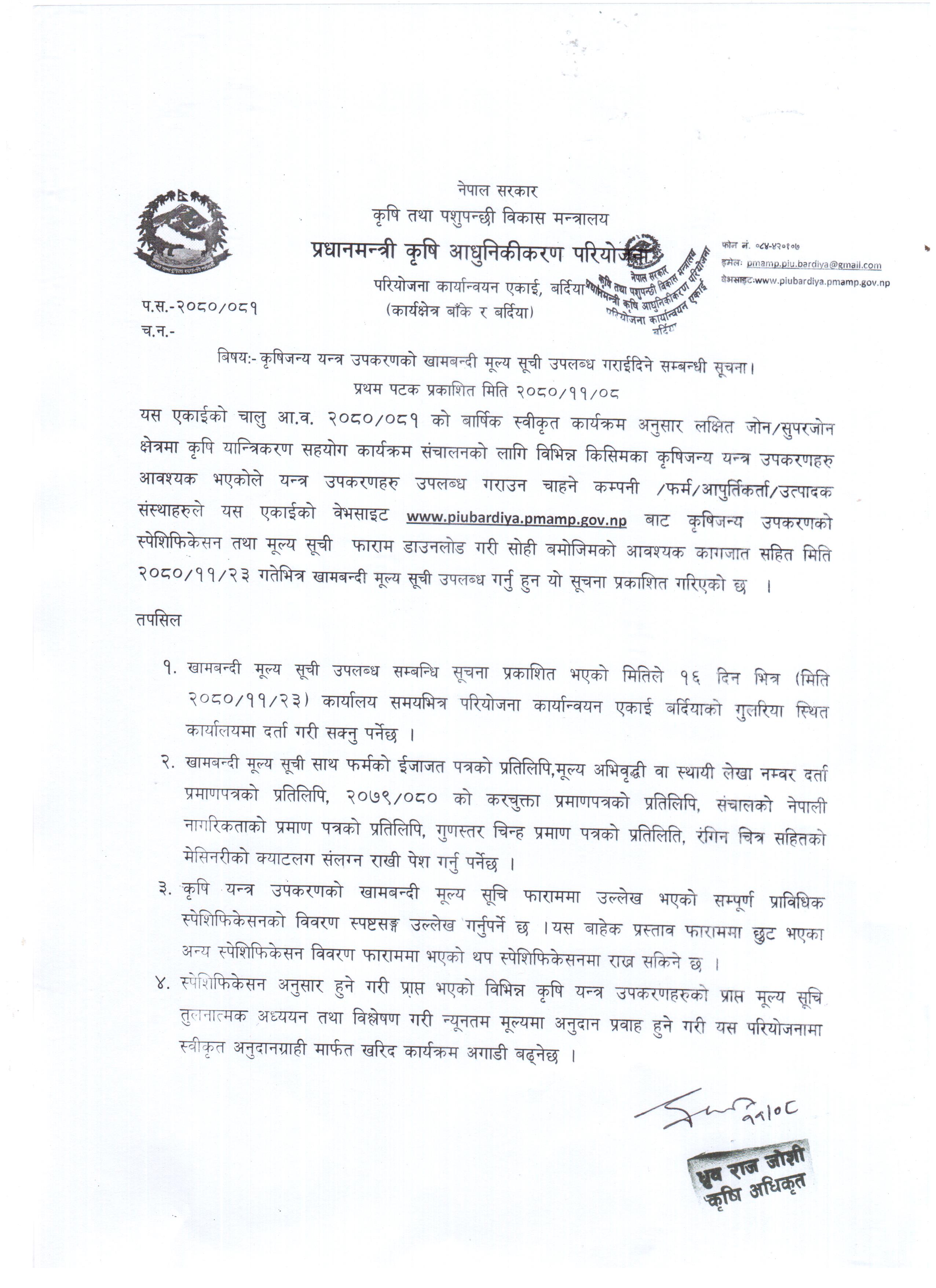 कृषिजन्य यन्त्र उपकरणको खामबन्दी मूल्य सूची उपलब्ध गराईदिने सम्बन्धी सूचना।