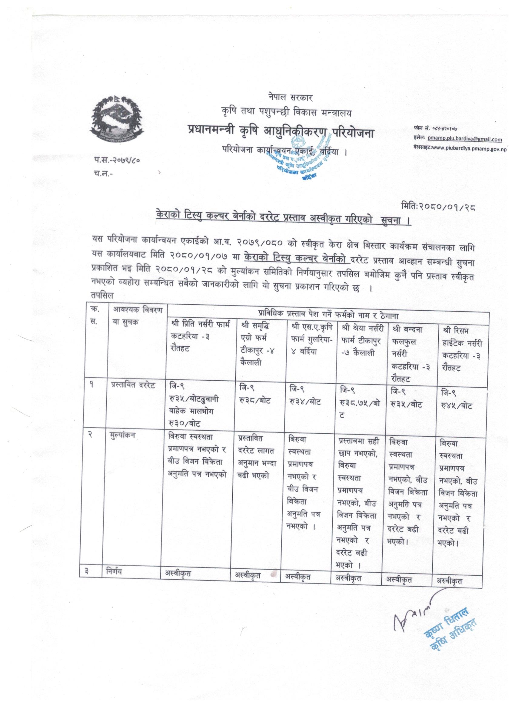 केराको टिस्यु कल्चर बेर्नाको दररेट प्रस्ताव अस्वीकृत गरिएको सूचना