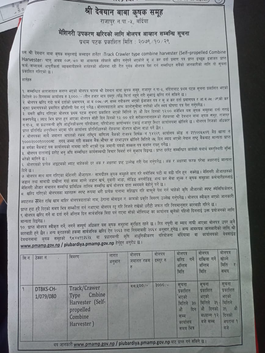 कम्वाईन हार्भेष्टर मेशिन खरिद सम्वन्धि सूचना ।