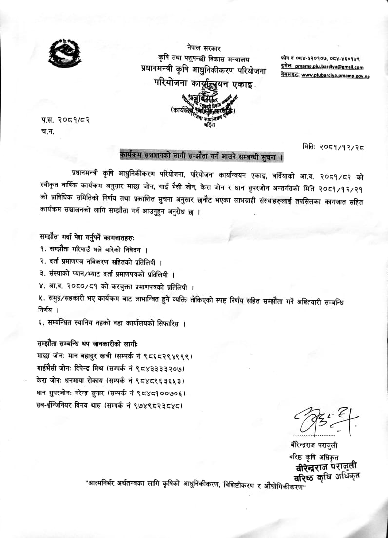धान सुपरजोन, गाइभैसी जोन, केरा जोन र माछा जोनका लाभग्राही सम्झौता गर्न आउने सम्बन्धि सुचना ।